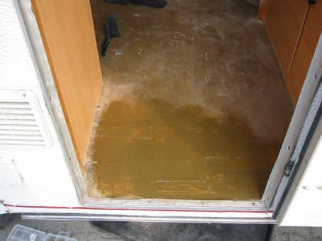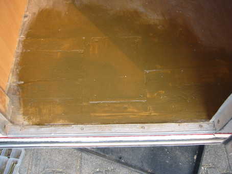 An den Ecken im hinteren Bereich habe ich vorher geübt. Den kompletten Boden habe ich übrigens mit dem Bandschleifer und dem Schwingschleifer abgeschliffen und mehrfach mit atmender Lasur versehen. Lack, Unterbodenschutz oder jegliche andere Beschichtung, die nicht luftdurchlässig ist, sollte weder innen noch am Unterboden verwendet werden, da der Boden durch die Lasur noch atmen kann. Eine ungeeignete Beschichtung garantiert in kurzer Zeit ein Feuchtbiotop im Zwischenboden, da sich dort die Feuchtigkeit sammelt aber nicht mehr raus kommt. Soviel zu “Uli’s kleiner Wohnwagenfibel” ;-)