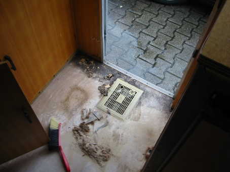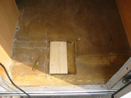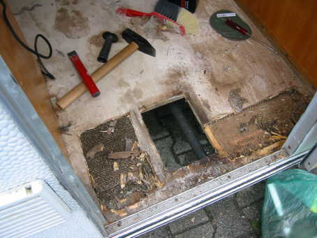 Für den, der es einmal selbst probieren möchte: Entgegen allen im Web kursierenden Infos ist die partielle Erneuerung des Bodens definitiv möglich. (und hält nun auch schon sechs Jahren einwandfrei).Die Problemstellung: Der Boden ist wie folgt aufgebaut: Unten eine grosse Spanplatte, darauf im Abstand von ca. 20cm Längsstreben, zwischen denen Pappe (oder heute Styropor) liegen, und darauf wieder eine grosse Spanplatte als Nutzfläche. Wie soll man diesen flicken? Mein Besuch in allen Foren des Web, Anfragen bei Wohnwagen-Oldie-Clubs etc, brachten mir die sichere Erkenntnis: Vergiss es, das geht nicht und Punkt. Ja, aber was soll ich denn mit meinem “Willy” machen? Nachdem ich nämlich den verklebten Teppich rausgerupft hatte, zeigte sich mir ein grausliches Bild: Der Boden, gerade im Eingangsbereich und in einigen Ecken, war nicht mehr zu retten, die Dämmung zwischen den Böden triefte und moderte. Die Unterseite des Teppich war aus einer Art Roßhaar, werksmäßig mit dem Sperrholz verklebt und war gleichzeitig eine der Hauptursachen für den Modergeruch. Doch es gibt eine Lösung: Im Nutzfahrzeugbau, sprich LKW-Aufbauten, gibt es eine Technik, um verunfallte Kofferaufbauten zu reparieren. Diese haben innen Zugösen, die gesetzlich mehrere hundert Klio pro cm² aushalten müssen. Wenn nun eine Beschädigung im Kofferaufbau dies Zugösen betrifft, wird nicht etwa der Aufbau erneuert: Nein, er wird partiell erneuert. Und diese Technik habe ich für meinen Boden angewand: Die Löcher bis über die nächste Strebe links und rechts der Schadstelle freilegen und passende Bohlen zusägen, die genau von der einen bIs über die andere Strebe reichen. Dann fräst man die intakten Streben im gesamten Bereich der Schadstelle um die Hälfte ab. Die Bohlen fräst man dann an den überlappenden Kanten um exakt das gleiche Maß ab, so dass sie von der einen bis zur anderen Strebe reichen und diese wie ein Korken abdecken. Dann nur noch verkleben und verschrauben, beischleifen und mit Lasur behandeln: Die Stärke der Strebe bleibt erhalten und die Lastverteilung ist sogar besser als im Original.