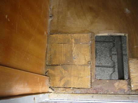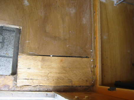 Zu sehen ist die obere Strebe, die im Anschluß an die Fotos um die Hälfte abgefräst wurde.Ebenso die rechte und linke Strebe, so dass ein neues Brett zugeschnitten werden konnte, dass wie ein Korken auf dieses Loch passt und auf allen vier Seiten auf den Streben aufliegt.