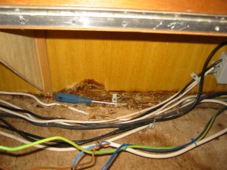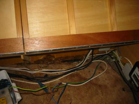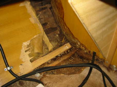 Die modernden Stellen seht Ihr ja, und nach Freilegung war der Blick auf die Straße frei. Problem: Wand UND Boden sind weggefault. Aber nichts überstürzen, erst einmal ist die Wand dran. Bis zum Außenblech freilegen, sauber zum gesunden Holz ausschneiden, Isolierung und neues Wandstück einsetzen.