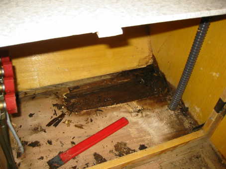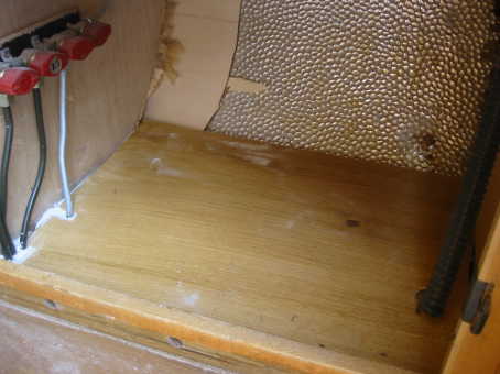........................eröffnete sich unten nach Entfernung des Bodenbelages eher unfreuliches: Der Boden und die hintere Wand incl. Dämmstoff bis zum Außenblech mußten raus